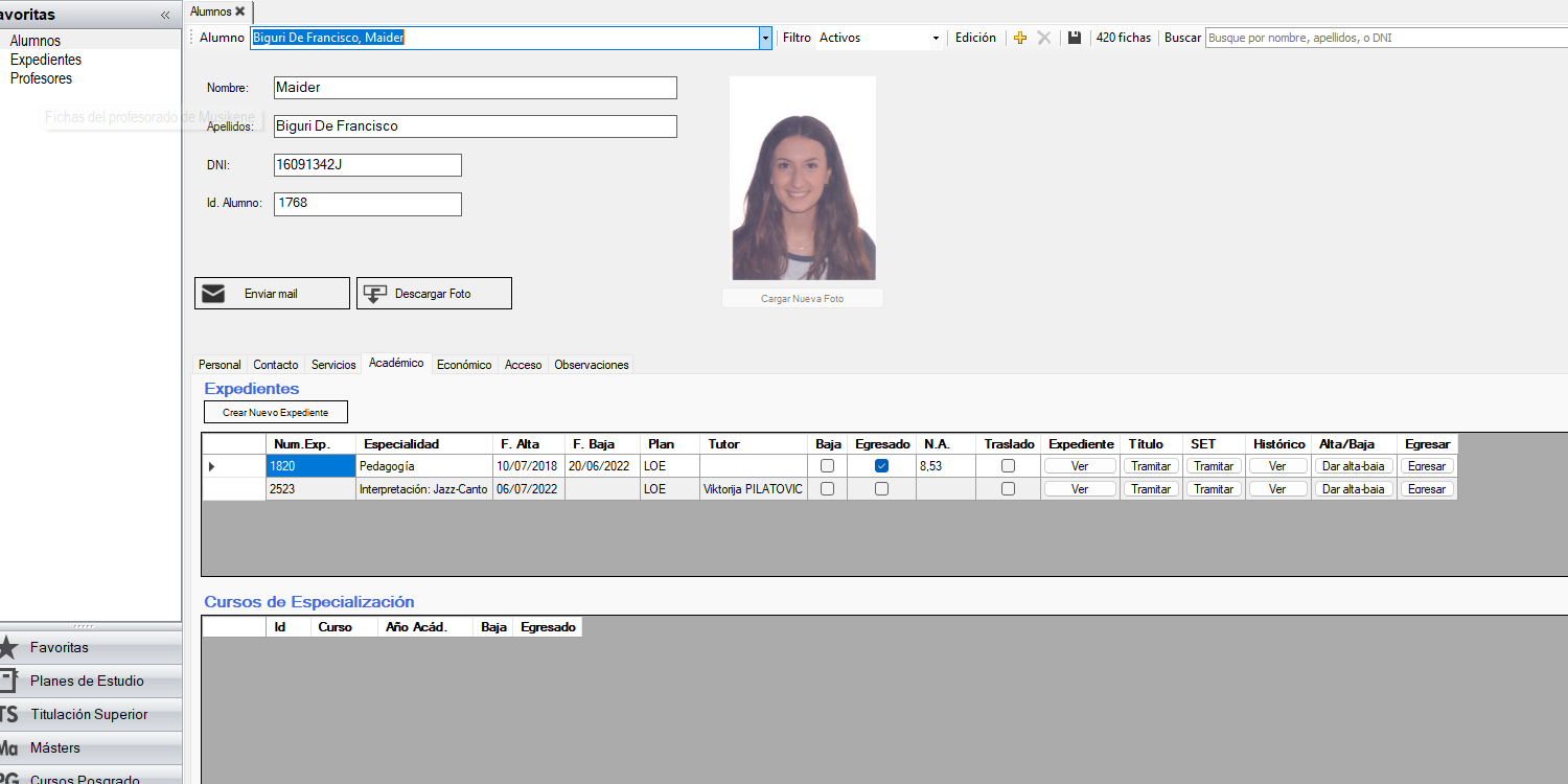 Ámbito: Administración académica Acceso: Usuarios autorizados desde red local de administración IR | + info